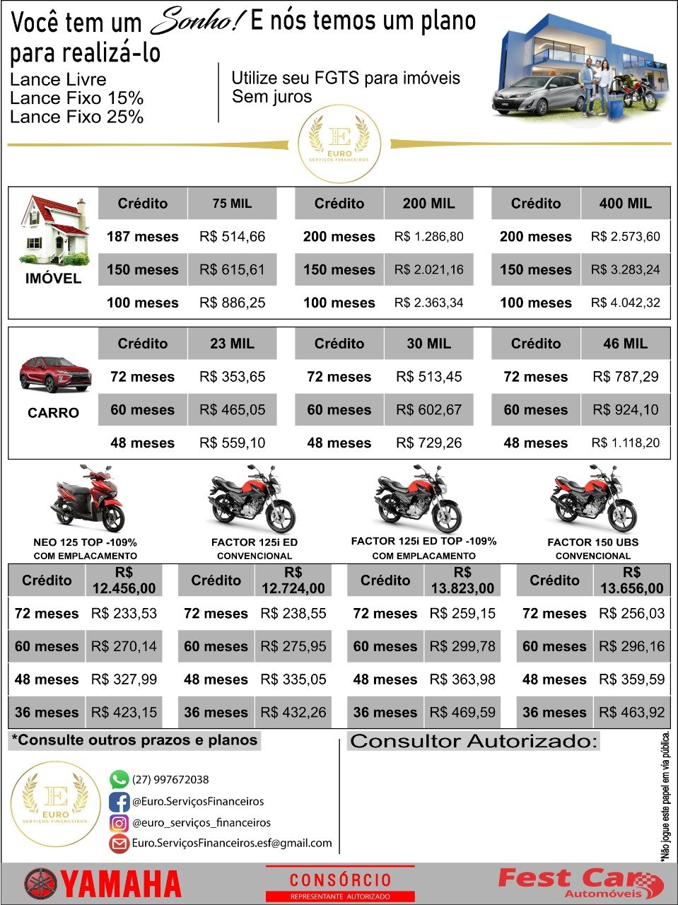 Na Euro Motors e consórcio você encontra às maiores administradora de consórcio do Brasil faça já sua cotação e tire seus planos do papel. Marcos: (27) 997672038